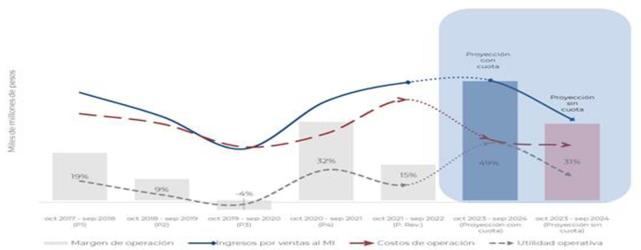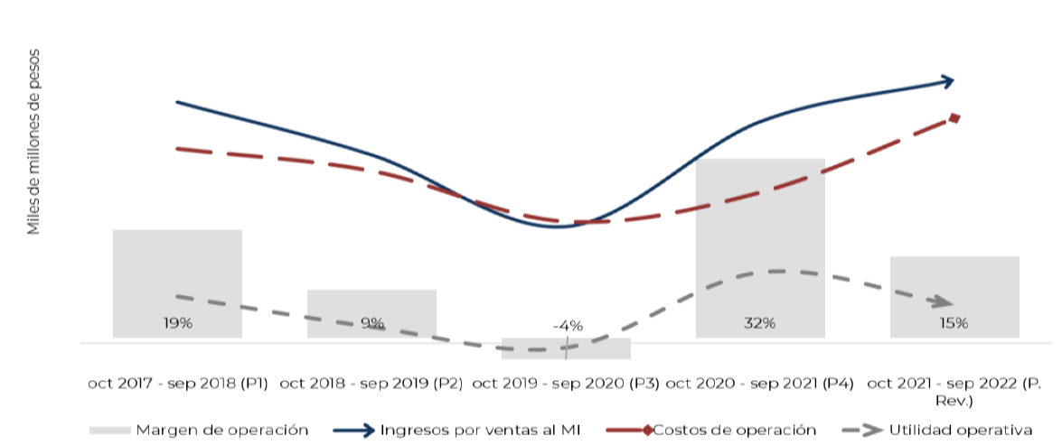 201. Por su parte, los costos de operación que resultaron de las ventas al mercado interno acumularon un crecimiento de 16% durante el periodo analizado: bajaron 11% y 29% en los periodos octubre 2018 - septiembre 2019 y octubre 2019 - septiembre 2020, respectivamente y aumentaron 24% en el periodo octubre 2020 - septiembre 2021 y 49% en el periodo de revisión.