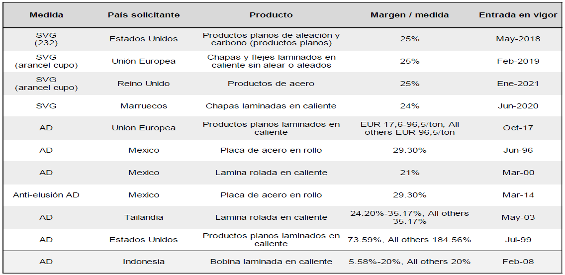 235. Ternium manifestó que como fue ampliamente documentado en el último examen de vigencia finalizado el 24 de noviembre de 2022, las exportaciones rusas de placa de acero en rollo han sido objeto de diversas medidas de remedio comercial, incluyendo medidas antidumping u otras (medidas de salvaguardia o bien aranceles bajo la sección 232 de los Estados Unidos), entre los que se encuentran los siguientes: