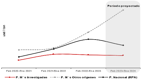 b. aunado a su pérdida de participación en el CNA, el precio promedio de las importaciones de otros orígenes se ubicó por arriba del precio promedio de venta al mercado interno de la rama de producción nacional en el periodo analizado, 24% en el periodo febrero de 2020-enero de 2021, 3% en el periodo febrero de 2021-enero de 2022 y 15% en el periodo investigado.