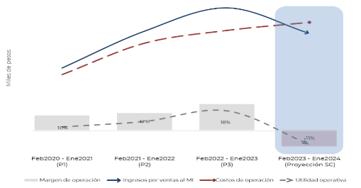 250. Adicionalmente, la Secretaría observó que, como resultado del comportamiento en los ingresos proyectados por ventas y de los costos operativos para el periodo febrero de 2023-enero de 2024 (disminución en ingresos de 20% y aumento de costos totales en 8%), los resultados operativos en el mercado nacional disminuirían 1.49 veces respecto al periodo investigado, al grado que reflejarían una pérdida operativa, disminuyendo el margen de operación 29 puntos porcentuales al pasar de 18% en el periodo investigado a 11% negativo en el periodo de proyección.