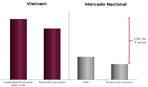 259. Los resultados descritos en los puntos anteriores sustentan, inicialmente, que Vietnam cuenta con una capacidad libremente disponible y un potencial exportador superiores en relación con el mercado nacional. Estas asimetrías aportan elementos suficientes que permiten determinar que la utilización de una parte de la capacidad libremente disponible con que cuenta el país investigado, o bien, de su potencial exportador, podría ser significativa para la producción y el mercado mexicano.