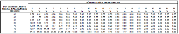 III. Cuando los bienes se enajenen, se pierdan o dejen de ser útiles, se podrá efectuar una deducción por la cantidad que resulte de aplicar, al monto original de la inversión ajustado con el factor de actualización correspondiente al periodo comprendido desde el mes en el que se adquirió el bien y hasta el último mes de la primera mitad del periodo en el que se haya efectuado la deducción señalada en el Artículo Primero de este decreto, los por cientos que resulten conforme al número de años transcurridos desde que se efectuó la deducción del artículo citado y el por ciento de deducción inmediata aplicado al bien de que se trate, conforme a lo siguiente: