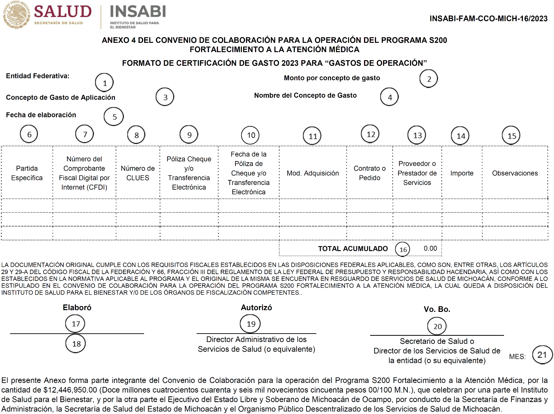 | 9 | Póliza Cheque y/o Transferencia Electrónica del pago efectuado | 20 | Titular de la Secretaría de Salud Estatal o Titular de los Servicios de Salud de la Entidad Federativa (o su equivalente) |
