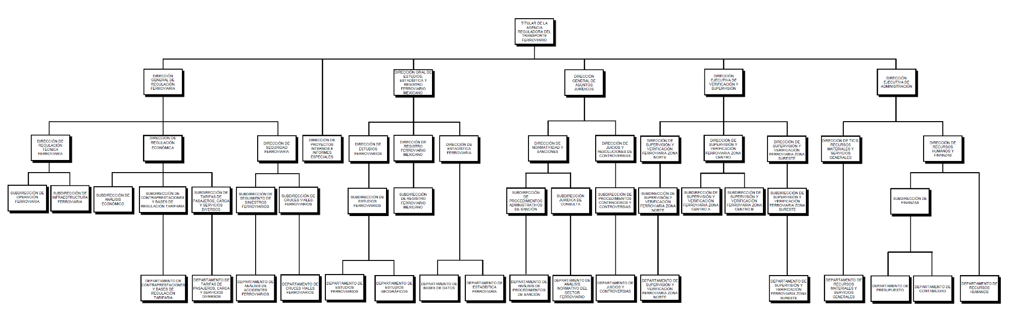 Posteriormente, el 10 de marzo de 2017, se publicó el Manual de Organización de la Agencia, resaltando que a esa fecha su estructura se encontraba en proceso de conformación, lo que motivó a que sólo se considerarán las funciones del Titular, así como las de las Direcciones Generales de Regulación Ferroviaria; Estudios, Estadística y Registro Ferroviario Mexicano; Asuntos Jurídicos y, en ese momento, las de las Direcciones Generales Adjuntas de Verificación y Seguridad y, Administración. Cabe resaltar, que tanto las Direcciones Generales y las Direcciones Generales Adjuntas, no consideraron atribuciones para la realización de actos que produzcan consecuencias al exterior.