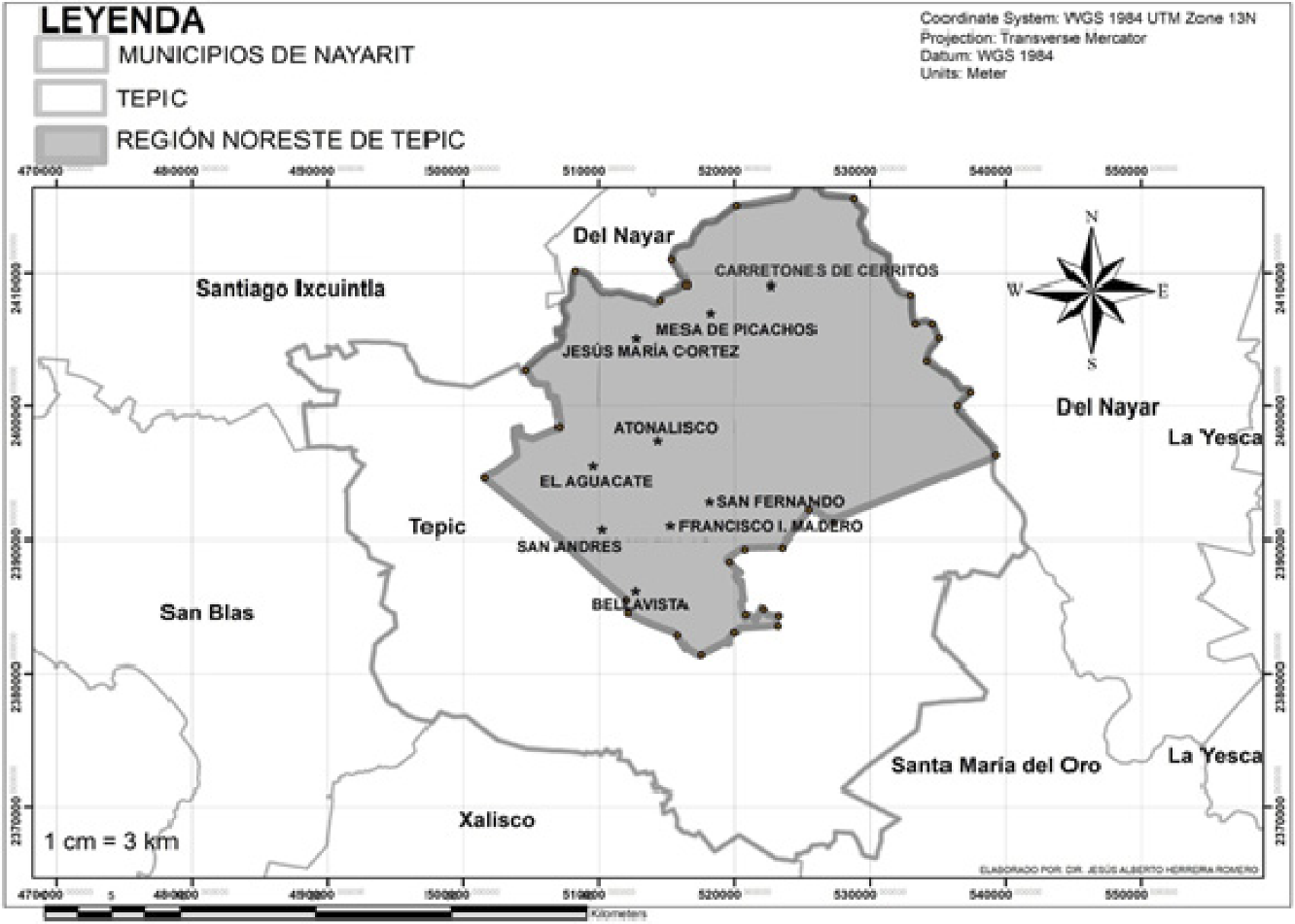 Mapa: La Región Noreste del municipio de Tepic, que comprende las comunidades Atonalisco, Bellavista, El