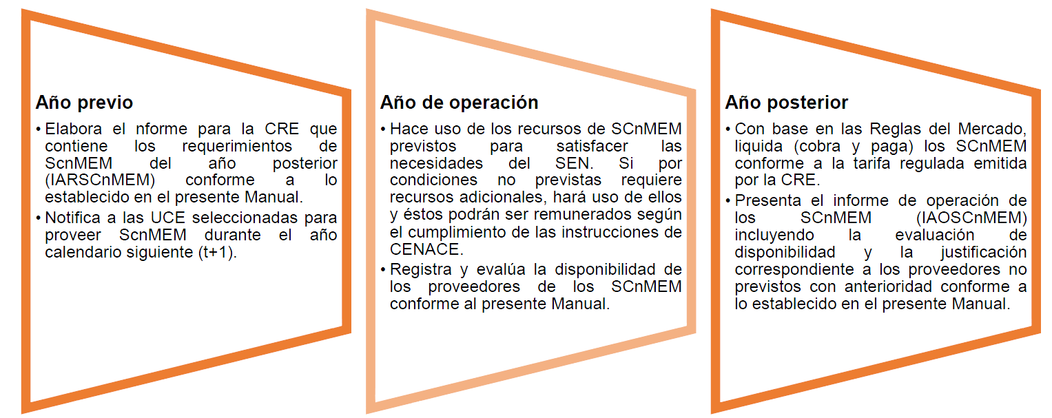 Los SCnMEM son aquellos servicios que proporcionan las UCE vinculados a la operación del SEN y que son necesarios para garantizar su Calidad, Confiabilidad, Continuidad y seguridad; serán requeridos por el CENACE a través de los mecanismos de adquisición, asignación, operación, verificación y liquidación que se establezcan en el presente Manual, las Reglas del Mercado y demás disposiciones aplicables.