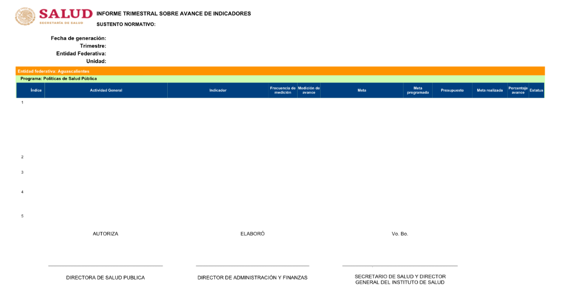 | No. | PROGRAMA | ÍNDICE | TIPO DE INDICADOR | NUMERADOR | DENOMINADOR | INDICADOR | META FEDERAL | META ESTATAL |