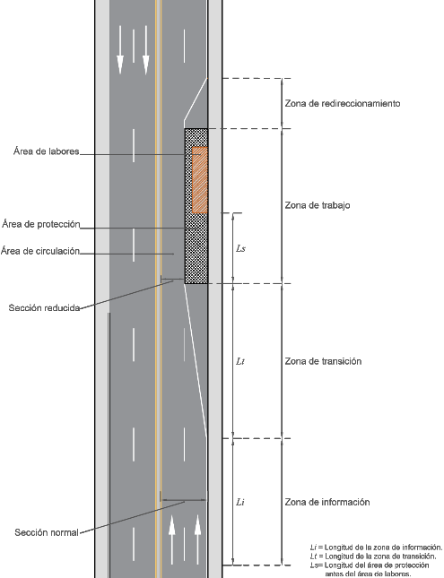 La zona de información que antecede a la zona de transición debe tener una longitud (Li) suficiente para informar a los usuarios con la anticipación debida, que adelante de su trayecto existe una zona donde se ejecutan trabajos que afectan la circulación normal de la carretera o vía urbana, por lo que es necesario instalar la señalización que indique a los conductores las precauciones, restricciones y guías, a su paso por ésta y que se debe reducir gradualmente la velocidad, en virtud de que la operación del tránsito se modificará por la reducción de la sección transversal, desvíos u otras situaciones. Esta longitud (Li) depende de las características físicas, geométricas y operacionales del tramo y su zona de influencia, así como de la diferencia de velocidades entre la velocidad en la carretera o vía urbana y la velocidad restringida en la zona de trabajo.