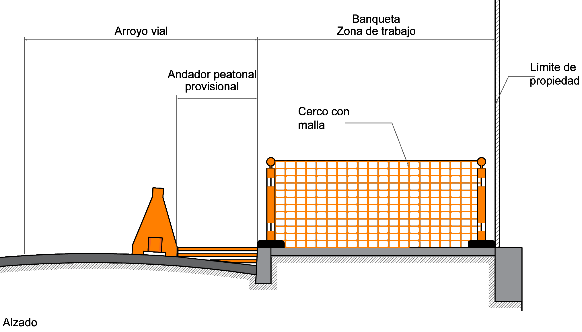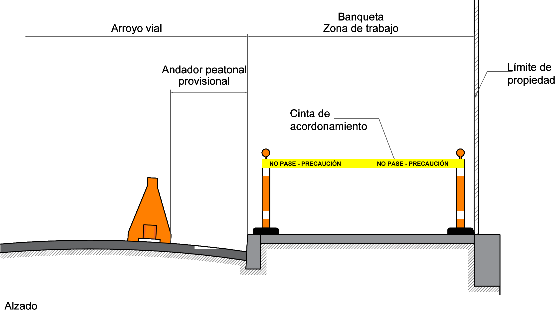 La ubicación y el dimensionamiento del área de labores dependen del tipo y magnitud de los trabajos de construcción, modernización, rehabilitación, conservación o mantenimiento que se vayan a realizar, del procedimiento para ejecutarlos incluyendo las maniobras del personal, de la maquinaria y del equipo de construcción, y del espacio necesario para almacenar los materiales. Esta área de labores determina la configuración de la zona de trabajo, pues requiere ser resguardada mediante un área de protección que separe los vehículos y peatones que transitan por el área de circulación, de manera que sus conductores y peatones tengan la posibilidad de reaccionar en el caso de que atraviesen los dispositivos de canalización o protección que limiten el área de circulación y eviten penetrar en el área de labores. El esquema de la figura 27 representa el uso de diversos dispositivos en el caso de desvíos peatonales, mismo que es esquemático y se presenta sólo como ejemplo, de manera ilustrativa mas no limitativa.