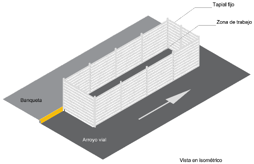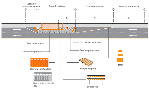 Conjunto integrado de marcas y señales que se colocan provisionalmente en las carreteras, vías urbanas y desviaciones, donde se ejecuten trabajos de construcción, modernización, rehabilitación, conservación o mantenimiento, para indicar la geometría temporal de esas vías públicas, regular el tránsito vehicular y peatonal, denotar los elementos estructurales que pudieran representar un riesgo, así como servir de guía a los usuarios en su paso por estas zonas. Se clasifica en: