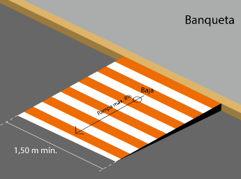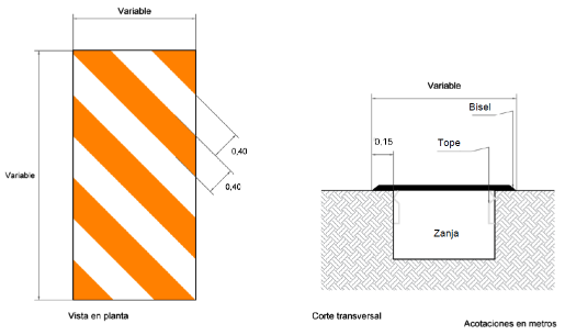 4.8.3.2. Área de protección: es la que circunda el área de labores, cuya función es la de separar el área de circulación del área de labores y estará delimitada por los dispositivos de canalización necesarios para permitir la reacción de los peatones y conductores de vehículos en general que pudieran atravesarlos. En esta área se encauza el tránsito de los peatones.