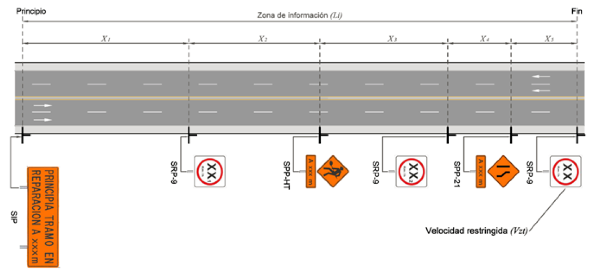 9.2.4. En la zona de información se debe considerar la instalación alternada de señales restrictivas (SRP-9) "VELOCIDAD", señales preventivas (SPP) y señales informativas (SIP), de tal manera que se reduzca gradualmente la velocidad en la carretera o vía urbana, preferentemente en intervalos de 20 km/h hasta llegar a la velocidad restringida (Vzt) al inicio de la zona de transición y entre éstas se colocarán las señales necesarias para prevenir de los riesgos que se requieran señalar e indicar con tableros adicionales y señales informativas (SIP) las distancias a la zona de trabajo, como se muestra en la figura 26.