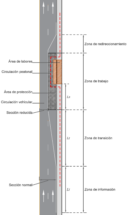Tramo de la carretera o vía urbana donde a través de dispositivos pertinentes se realiza el cambio de la sección normal de la carretera o vía urbana a la sección reducida que se diseñe para la zona de trabajo, o donde se realizan desviaciones del tránsito peatonal o vehicular.