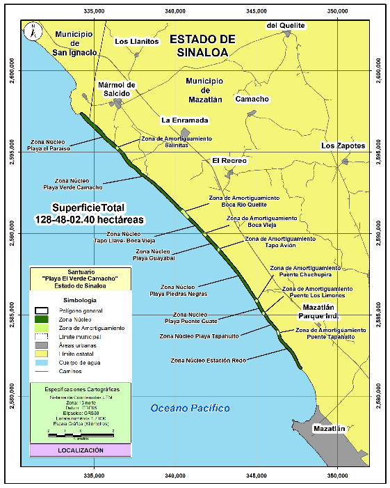 Con Aviso publicado en el Diario Oficial de la Federación, el día 12 de octubre de 2023, se puso a disposición del público en general el estudio elaborado por la Comisión Nacional de Áreas Naturales Protegidas para justificar la expedición de la declaratoria por la cual se pretende establecer como área natural protegida con el carácter de santuario, el sitio conocido como Playa El Verde Camacho, ubicado en los municipios de Mazatlán y San Ignacio, en el estado de Sinaloa, mismo que posee las características que se citan a continuación para su identificación: