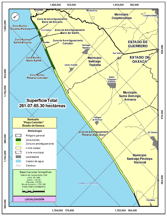 Localización: El polígono de la propuesta de área natural protegida se localiza en las siguientes coordenadas extremas con una proyección UTM, zona 14 Norte, con un Datum ITRF08: