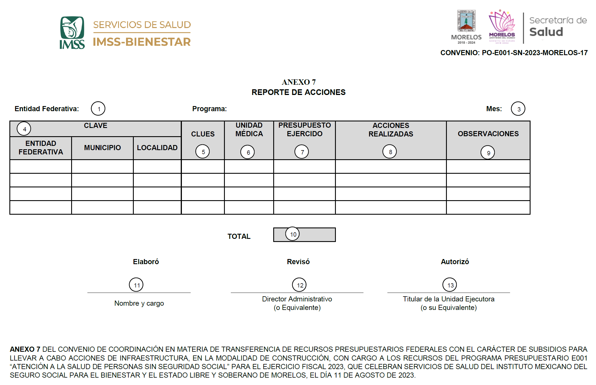 ANEXO 7 DEL CONVENIO DE COORDINACIÓN EN MATERIA DE TRANSFERENCIA DE RECURSOS PRESUPUESTARIOS FEDERALES CON EL CARÁCTER DE SUBSIDIOS PARA LLEVAR A CABO ACCIONES DE INFRAESTRUCTURA, EN LA MODALIDAD DE CONSTRUCCIÓN, CON CARGO A LOS RECURSOS DEL PROGRAMA PRESUPUESTARIO E001 "ATENCIÓN A LA SALUD DE PERSONAS SIN SEGURIDAD SOCIAL" PARA EL EJERCICIO FISCAL 2023, QUE CELEBRAN SERVICIOS DE SALUD DEL INSTITUTO MEXICANO DEL SEGURO SOCIAL PARA EL BIENESTAR Y EL ESTADO LIBRE Y SOBERANO DE MORELOS, EL DÍA 11 DE AGOSTO DE 2023.