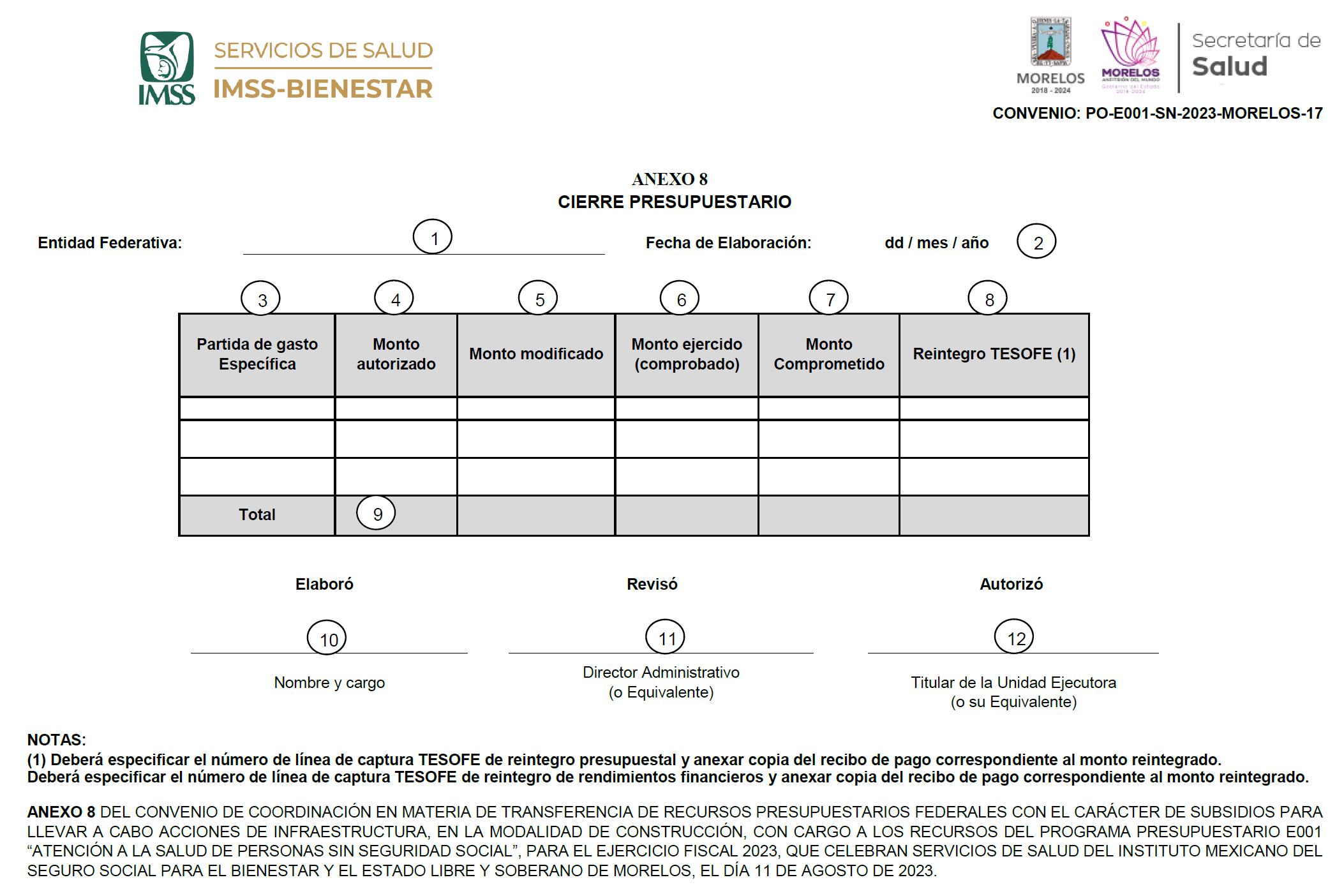 FIRMAS DE LOS ANEXOS 1, 2, 3, 4, 5, 6, 7 Y 8 DEL CONVENIO DE COORDINACIÓN EN MATERIA DE TRANSFERENCIA DE RECURSOS PRESUPUESTARIOS FEDERALES CON EL CARÁCTER DE SUBSIDIOS PARA LLEVAR A CABO ACCIONES DE INFRAESTRUCTURA, EN LA MODALIDAD DE CONSTRUCCIÓN CON CARGO A LOS RECURSOS DEL PROGRAMA PRESUPUESTARIO E001 "ATENCIÓN A LA SALUD DE LAS PERSONAS SIN SEGURIDAD SOCIAL" PARA EL EJERCICIO FISCAL 2023, QUE CELEBRAN SERVICIOS DE SALUD DEL INSTITUTO MEXICANO DEL SEGURO SOCIAL PARA EL BIENESTAR Y EL GOBIERNO DEL ESTADO LIBRE Y SOBERANO DE MORELOS, EL DÍA 11 DE AGOSTO DE 2023.