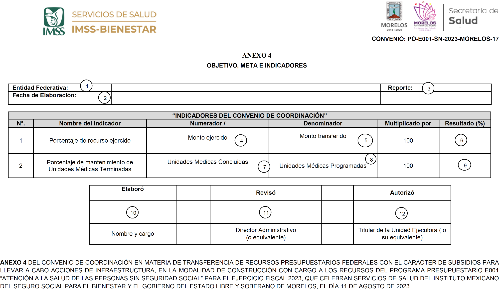 ANEXO 4 DEL CONVENIO DE COORDINACIÓN EN MATERIA DE TRANSFERENCIA DE RECURSOS PRESUPUESTARIOS FEDERALES CON EL CARÁCTER DE SUBSIDIOS PARA LLEVAR A CABO ACCIONES DE INFRAESTRUCTURA, EN LA MODALIDAD DE CONSTRUCCIÓN, CON CARGO A LOS RECURSOS DEL PROGRAMA PRESUPUESTARIO E001 "ATENCIÓN A LA SALUD DE PERSONAS SIN SEGURIDAD SOCIAL", PARA EL EJERCICIO FISCAL 2023, QUE CELEBRAN SERVICIOS DE SALUD DEL INSTITUTO MEXICANO DEL SEGURO SOCIAL PARA EL BIENESTAR Y EL ESTADO LIBRE Y SOBERANO DE MORELOS, EL DÍA 11 DE AGOSTO DE 2023.