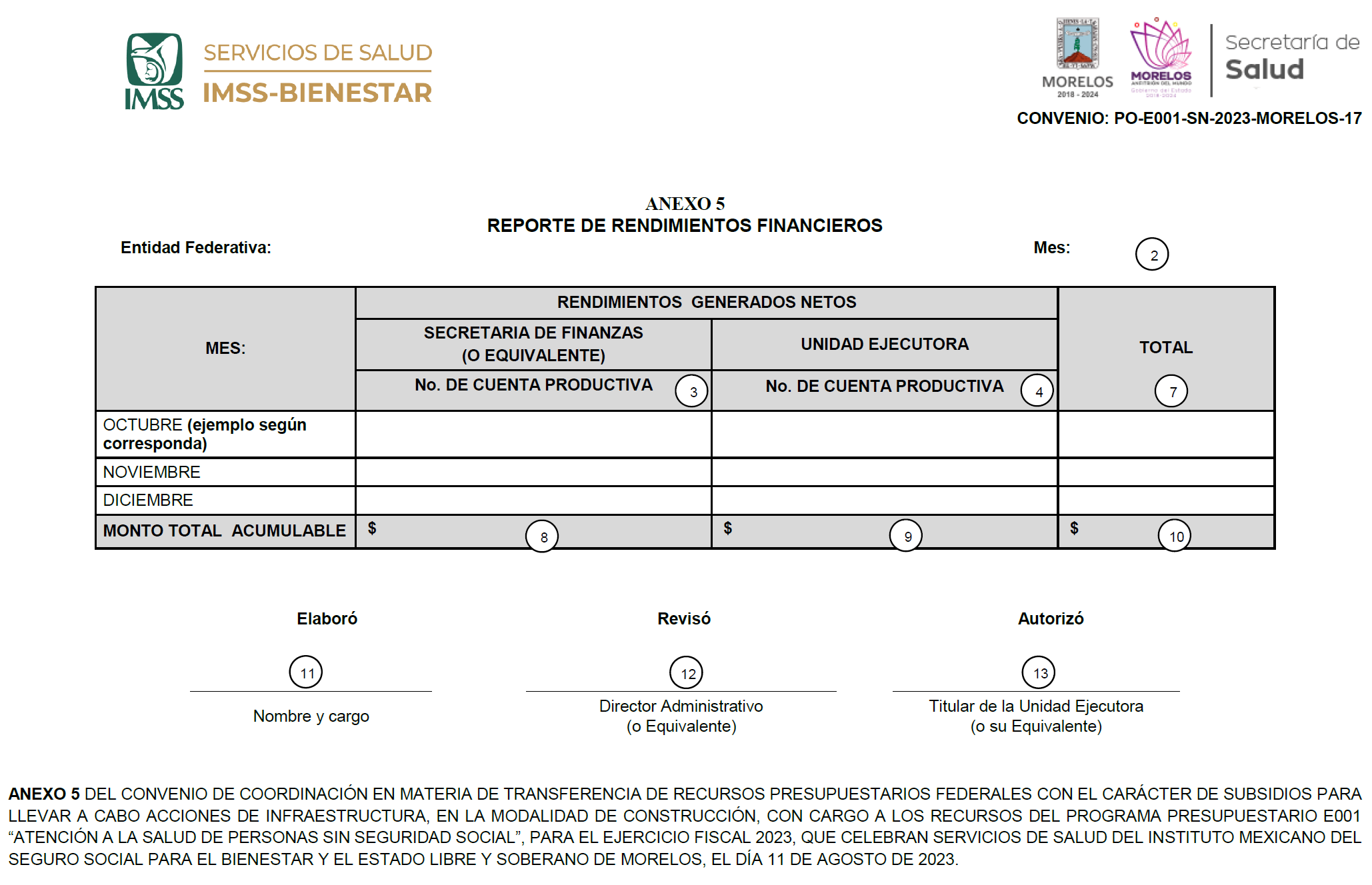 Nota: La Unidad Ejecutora deberá de presentar de manera mensual el registro y control del Formato "Reporte de Rendimientos Financieros" ante el IMSS-BIENESTAR, acompañado de los estados de cuenta bancarios de la Secretaría de Finanzas (o su equivalente) y de la Unidad Ejecutora.