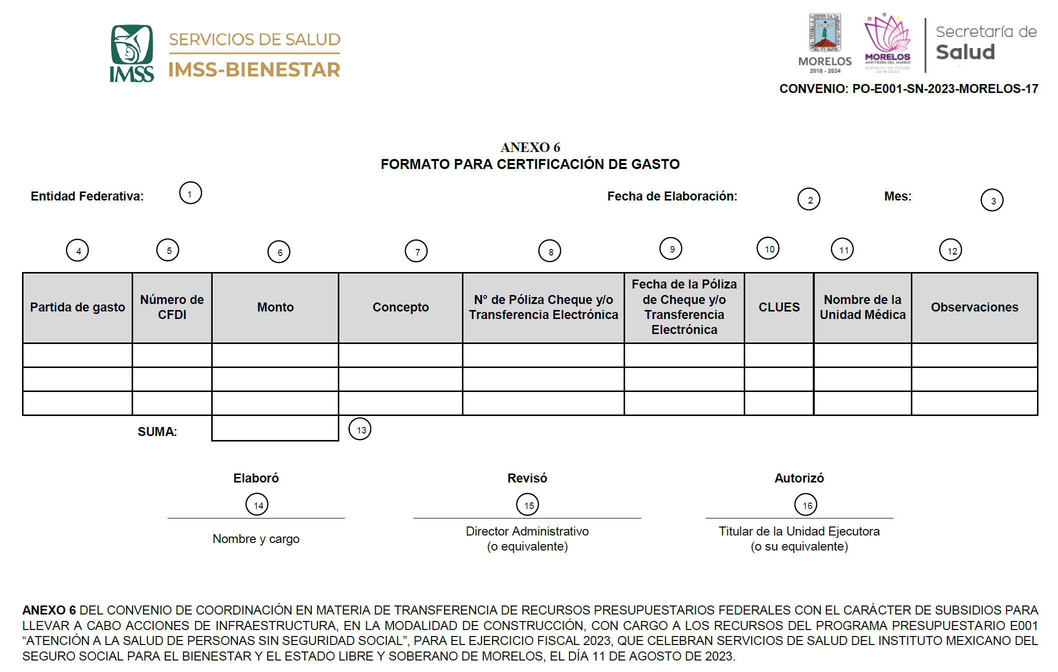 ANEXO 6 DEL CONVENIO DE COORDINACIÓN EN MATERIA DE TRANSFERENCIA DE RECURSOS PRESUPUESTARIOS FEDERALES CON EL CARÁCTER DE SUBSIDIOS PARA LLEVAR A CABO ACCIONES DE INFRAESTRUCTURA, EN LA MODALIDAD DE CONSTRUCCIÓN, CON CARGO A LOS RECURSOS DEL PROGRAMA PRESUPUESTARIO E001 "ATENCIÓN A LA SALUD DE PERSONAS SIN SEGURIDAD SOCIAL", PARA EL EJERCICIO FISCAL 2023, QUE CELEBRAN SERVICIOS DE SALUD DEL INSTITUTO MEXICANO DEL SEGURO SOCIAL PARA EL BIENESTAR Y EL ESTADO LIBRE Y SOBERANO DE MORELOS, EL DÍA 11 DE AGOSTO DE 2023.