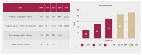 | 78.37% | Con fecha 7 de enero de 2022, Altán Redes ejerció su derecho ante el IFT, de solicitar por única ocasión prórroga a los compromisos de cobertura establecidos en el Título de Concesión Mayorista del cual es titular, prórroga que fue autorizada por el IFT con fecha 23 de febrero de 2022, en los siguientes términos: 1. Hito del 70% del 24 de enero de 2022 al 30 de noviembre de 2022. 2. Hito del 92.2% del 24 de enero de 2024 al 24 de enero de 2028. 3. Prorrogar los mismos compromisos de cobertura, que de manera idéntica se contemplan en el Título de Concesión de Espectro del cual es titular Promtel. Con fecha 22 de junio de 2022, se celebró el Segundo Convenio Modificatorio al Contrato APP entre PROMTEL, TELECOMM (ahora Financiera Para el Bienestar) y la empresa Altán Redes, que en la parte conducente señala: Modificación de la vigencia a un total de 40 años (de 20 a 40 años). Modificar el Calendario de Despliegue: · Hito del 70% al 30 de noviembre de 2022. · Hito del 85% al 24 de enero de 2027. · Hito del 92.2% al 24 de enero de 2028. Debido a que, en el año 2022, está programado el cumplimiento del Hito del 70%, que se certifica en el año 2023. Para el año 2024, no se tiene comprometido el cumplimiento de ningún Hito de Cobertura dentro del contrato APP. Sin embargo, se continúa trabajando en actividades de supervisión y monitoreo de la operación en la Red Compartida. | |||||||||||||||||