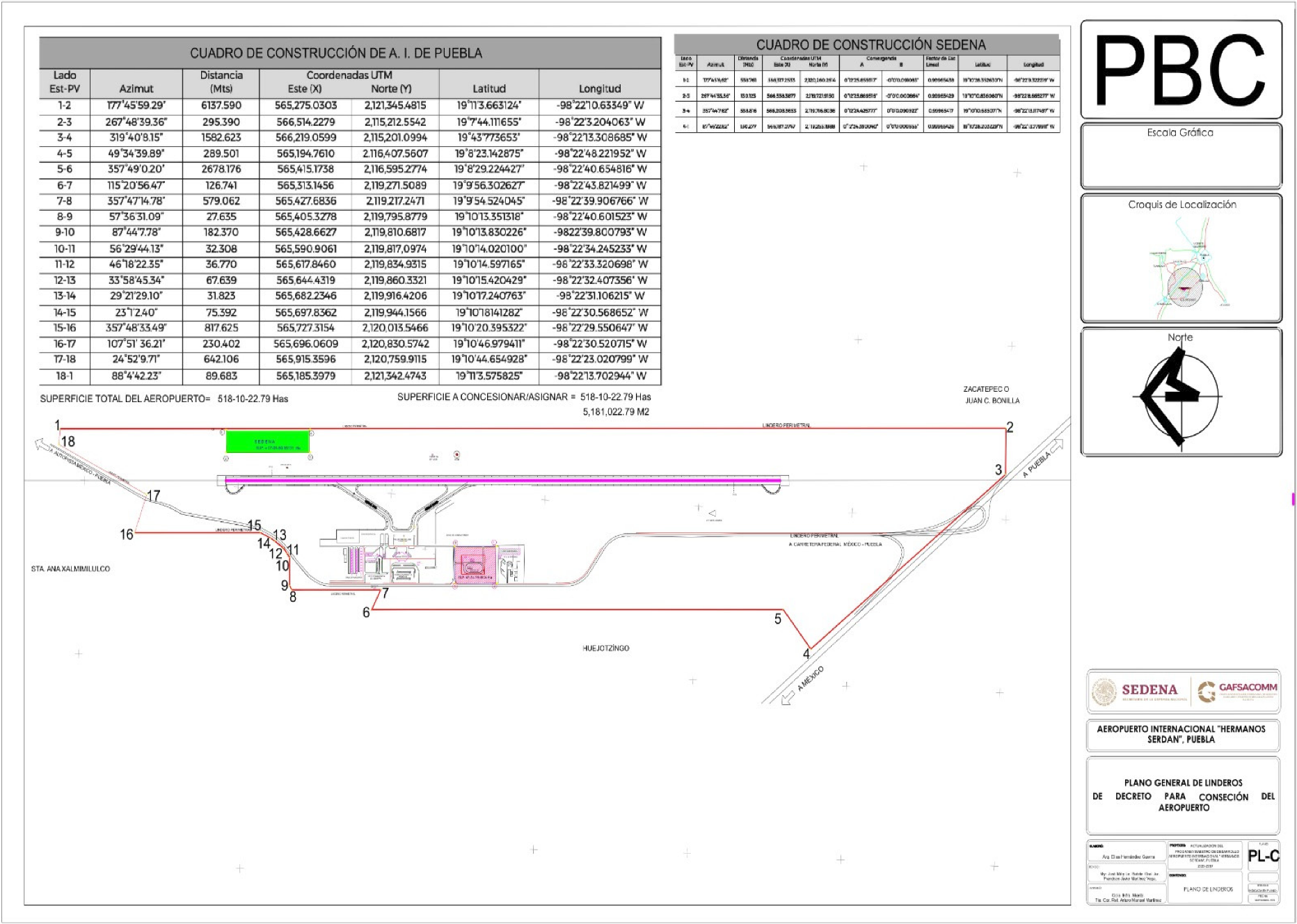 VIII. La "SECRETARÍA", con fecha 17 de enero de 2014, otorgó título de concesión a favor de Aeropuertos y Servicios Auxiliares, organismo público descentralizado del Gobierno Federal (ASA), lo cual se dio a conocer en el Diario Oficial de la Federación el 10 de abril de 2014, respecto del Aeropuerto Internacional "Hermanos Serdán", ubicado entre los Municipios de Huejotzingo, Juan C. Bonilla y Tlaltenango, en el Estado de Puebla, que cuenta con un Acuerdo que declara aeródromo internacional el aeropuerto denominado Hermanos Serdán ubicado en el Estado de Puebla, publicado en el Diario Oficial de la Federación el 23 de enero de 1996. ASA presentó su formal renuncia a esta concesión mediante oficio ASA/A/209/2023 de fecha 4 de octubre de 2023, presentado al día siguiente a esta "SECRETARÍA".