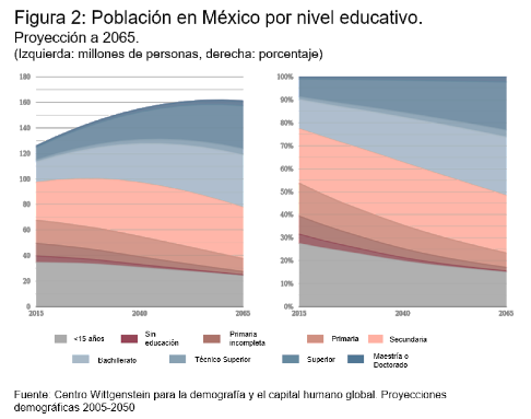 En México, la proporción de la población que cuenta con educación superior completa se incrementó de forma significativa en las últimas décadas (Figura 1), pasando de menos de 5% en 1980 a cerca de 10% en 2010(1). Se estima que esta proporción llegue a niveles cercanos a 20% en 2040, manteniendo uno de los porcentajes más altos en América Latina dentro de este rubro. En contraste, se estima que en México el porcentaje de personas entre 25 y 64 años que cuentan con estudios de posgrado se encuentra alrededor del 1.4% de la población(2) y para los próximos 20 años no se espera que esta proporción supere el 2% de la población mayor a 15 años (Figura 2).