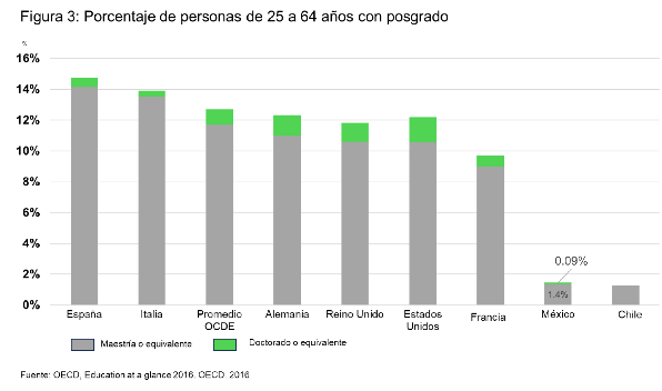 En comparación, podemos observar que el porcentaje promedio de población con posgrado para los países miembros de la OCDE es cercano a 12% (Figura 3), lo que coloca a nuestro país muy por debajo de este promedio.