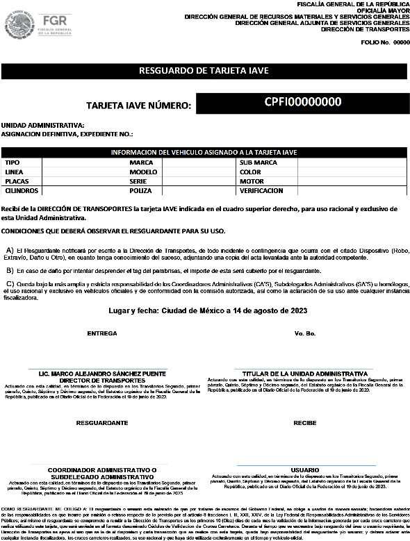 | NOTA: EL RESGUARDATARIO SE COMPROMETE A DAR BUEN USO A LA TARJETA ADHERIDA, EN EL ENTENDIDO DE QUE EN EL CASO DE DAÑO, | ||||||||||