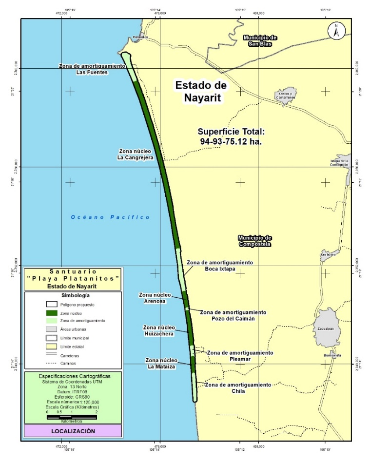 Localización: El polígono de la propuesta de área natural protegida se localiza en las siguientes coordenadas extremas con una proyección UTM, zona 13 Norte, con un Datum ITRF08: