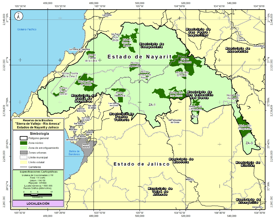 Ubicación: municipios de Bahía de Banderas y Compostela en el estado de Nayarit y en los municipios de Mascota, Mixtlán, San Sebastián del Oeste y Puerto Vallarta en el estado de Jalisco.