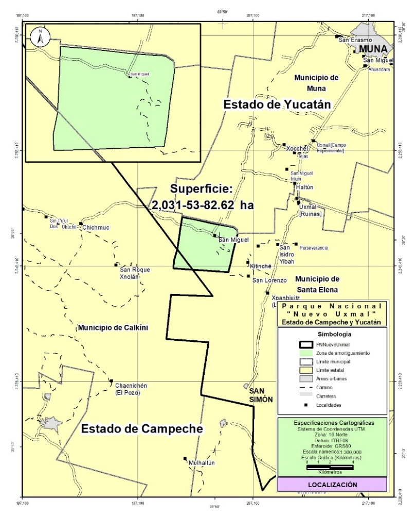 Con Aviso publicado en el Diario Oficial de la Federación, el día 8 de noviembre de 2023, se puso a disposición del público en general el estudio realizado por la Comisión Nacional de Áreas Naturales Protegidas para justificar la expedición del Decreto por el que se pretende declarar como área natural protegida con el carácter de parque nacional Nuevo Uxmal, ubicado en el municipio de Santa Elena, estado de Yucatán y el municipio de Calkiní, estado de Campeche, mismo que posee las características que se citan a continuación para su identificación: