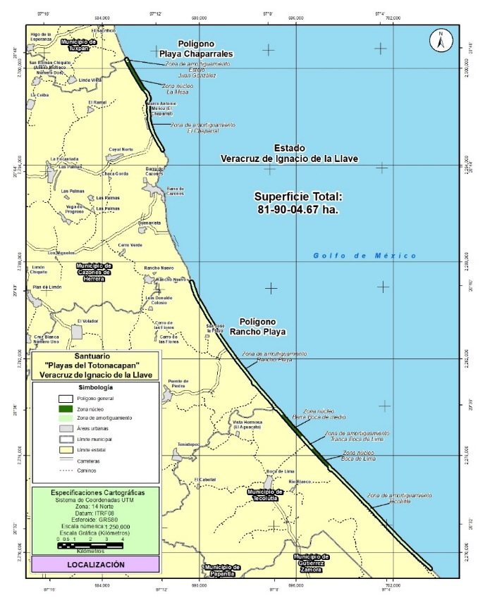 Localización: El polígono de la propuesta de área natural protegida se localiza en las siguientes coordenadas extremas con una proyección UTM, zona 14 Norte, con un Datum ITRF08: