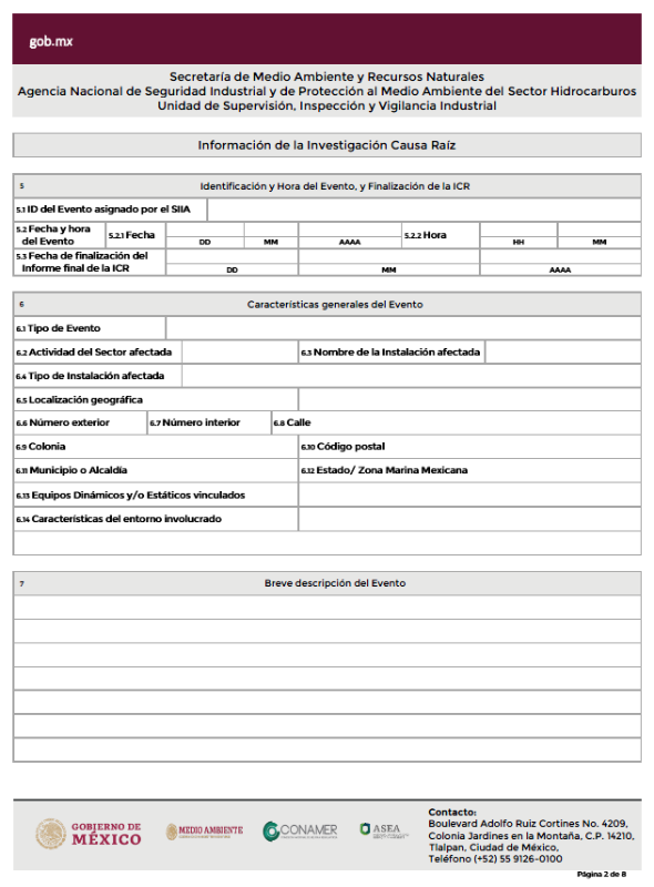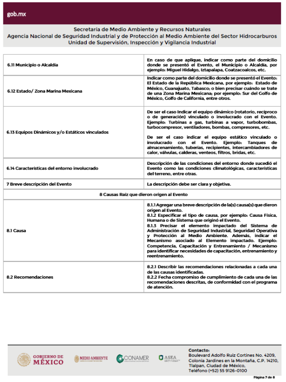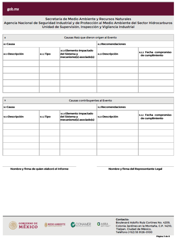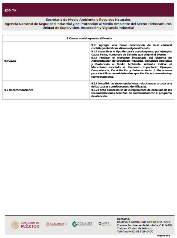 VIII. Causas contribuyentes al Evento. Para cada Causa contribuyente, deberá identificarse el tipo de causa (física, humana y/o de sistema) y los elementos impactados del Sistema de Administración de Seguridad Industrial, Seguridad Operativa y de protección al medio ambiente, así como los mecanismos asociados a dichos elementos. Además, deberá contener las recomendaciones derivadas de la ICR, incluyendo su programa de atención y fecha de cumplimiento correspondiente.