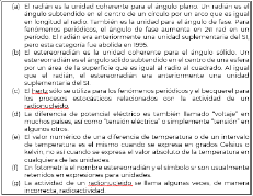 | Tabla 4-Unidades SI derivadas coherentes con nombres y símbolos especiales. estereorradián | esterradián | Se propone homologar el término "estereorradián" para consistencia de la regulación | De conformidad con el artículo 47, fracciones II y III y 64 de la Ley Federal sobre Metrología y Normalización (LFMN), el CCONNSE y su Grupo de Trabajo instalado analizaron el comentario a este capítulo y decidieron no aceptarlo, toda vez que la traducción al español corresponde a estereorradián y descrito en el SI. Tabla 5 - Unidades SI derivadas coherentes con nombres y símbolos especiales estereorradián(b) |