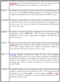 | 5.1 Unidades de base Sin correlativo | Nuevo texto Tabla 3 - Definiciones de las unidades de base. | Se agrega tabla de constantes definitorias, la Tabla2 se convierte en la Tabla 3 y se colocan las magnitudes en el orden de dependencia. La nota sobre el mol se agrega directamente en la definición para mayor comprensión. | De conformidad con el artículo 47, fracciones II y III y 64 de la Ley Federal sobre Metrología y Normalización (LFMN), el CCONNSE y su Grupo de Trabajo instalado analizaron el comentario a este capítulo y decidieron aceptarlo conforme al SI, para quedar de la siguiente manera: Tabla 3 - Definiciones de las unidades de base |