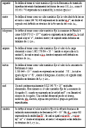 | APÉNDICE A (Informativo) Algunas unidades no pertenecientes al SI y sus equivalencias con las unidades del SI A.1 Generalidades El Sistema Internacional de Unidades, SI, es un sistema de unidades adoptado por la Conferencia General de Unidades de Medida (CGPM) que proporciona las unidades de referencia aprobadas internacionalmente, en función de las cuales se definen todas las demás unidades. Se recomienda su utilización en la ciencia, la tecnología, la ingeniería y el comercio. Las unidades de base del SI, y las unidades derivadas coherentes, incluyendo aquellas que tienen nombres especiales, tienen la importante ventaja de formar un conjunto coherente de unidades lo cual significa que no es necesario efectuar conversiones de unidades cuando se dan valores particulares a las magnitudes en las ecuaciones que las relacionan; por esta propiedad el SI es un conjunto de unidades coherentes. Como el SI es el único sistema de unidades reconocido a nivel mundial, ofrece la clara ventaja de establecer un lenguaje universal. En definitiva, si el SI se usara universalmente, se simplificaría la enseñanza de la ciencia y de la tecnología en la próxima generación. No obstante, es claro que ciertas unidades no pertenecientes al SI aún aparecen en publicaciones científicas, técnicas y comerciales y que continuarán en uso durante muchos años. Algunas unidades no pertenecientes al SI son de importancia histórica; otras, como las unidades de tiempo y de ángulo, se encuentran tan ancladas en la historia y en la cultura humanas que seguirán siendo utilizadas en el futuro. Por otra parte, los científicos deben tener la libertad de utilizar ocasionalmente unidades no pertenecientes al SI, si lo consideran ventajoso para su trabajo; por ejemplo, la utilización de unidades CGS-Gauss para la teoría electromagnética aplicada a la electrodinámica cuántica y a la relatividad. Por estas razones, se considera útil establecer, en las tablas que siguen, listados de las unidades más importantes no pertenecientes al SI. Debe tenerse presente, sin embargo, que al emplear estas unidades se pierde una parte importante de las ventajas del SI. La inclusión de unidades no pertenecientes al SI en este Proyecto de Norma Oficial Mexicana no implica recomendación alguna para su uso. Por las razones expuestas, en general es preferible el empleo de las unidades SI. También es deseable evitar el uso conjunto de unidades no pertenecientes al SI y de unidades SI; en especial, la combinación en una sola unidad de unidades no pertenecientes al SI y de unidades SI debe restringirse a casos particulares a fin de no demeritar las propiedades del SI. Finalmente, si se decide utilizar las unidades no pertenecientes al SI que figuran en las Tablas A.1, A.2 y A.3, es necesario hacerlo únicamente en circunstancias particulares y considerar sus definiciones en función de las unidades SI correspondientes. | La naturaleza de las siete constantes definitorias La naturaleza de las siete constantes definitorias del SI comprende desde las constantes fundamentales de la naturaleza hasta las constantes técnicas. El uso de una constante para definir una unidad implica separar la definición de la realización. Esto abre la posibilidad de desarrollar realizaciones prácticas totalmente diferentes o novedosas e incluso mejores, de acuerdo al desarrollo tecnológico, sin que sea necesario modificar la definición de la unidad. Una constante técnica, Kcd, la eficacia luminosa de una radiación monocromática de frecuencia 540 × 1012 Hz se refiere a una aplicación especial. En principio puede escogerse libremente, incluyendo los factores fisiológicos convencionales y otros factores de ponderación. En contraste con el uso de una constante fundamental de la naturaleza, la cual en general no permite esta adaptación debido a que se define por ecuaciones de la física y otras constantes. El conjunto de las siete constantes definitorias ha sido determinado para proporcionar una referencia fundamental, estable y universal que simultáneamente permita la realización práctica con la más mínima incertidumbre. Las convenciones elegidas y las especificaciones técnicas también consideran el desarrollo histórico. La constante de Planck h y la velocidad de la luz en el vacío c, ambas son descritas apropiadamente como fundamentales. Estas determinan los efectos cuánticos y el espacio-tiempo, respectivamente y afectan todas las partículas y campos por igual en todas las escalas y en todos los ambientes. La carga elemental e corresponde a una constante de acoplamiento de la fuerza electromagnética a través de la constante de la estructura fina = e2/(2c0h), donde 0 es la permitividad eléctrica del vacío (también llamada la constante eléctrica). Algunas teorías 84predicen una variación de en el tiempo. Sin embargo, los límites experimentales de la variación máxima posible de son tan bajos, que cualquier efecto predecible en las mediciones prácticas puede ser excluido. La constante de Boltzmann k es una constante proporcional entre las magnitudes de temperatura (con la unidad kelvin) y energía (joule), por lo cual el valor numérico es obtenido de especificaciones históricas de la escala de temperatura. La temperatura de un sistema varía con la energía térmica, pero no necesariamente con la energía interna. En física estadística la constante de Boltzmann conecta la entropía S con el número de los estados cuántico-mecánicos accesibles, S = k × . La frecuencia de cesio DnCs, esto es, la frecuencia de la transición hiperfina del estado de base no perturbado del átomo Cesio 133, tiene el carácter de un parámetro atómico, el cual puede ser afectado por el entorno, como son los campos electromagnéticos. Sin embargo, la transición subyacente es bien conocida, estable y representa una buena selección como una referencia de transición bajo consideraciones prácticas. Elegir un parámetro atómico como Dn