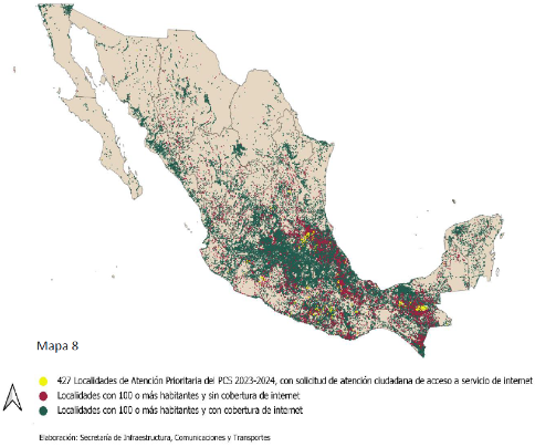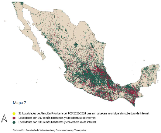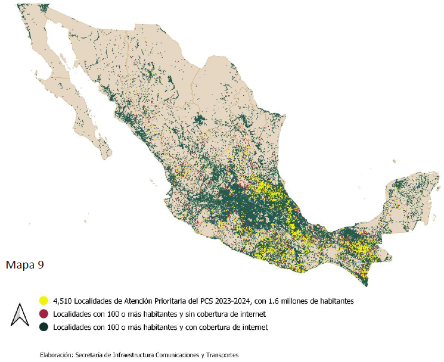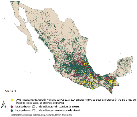 Es por ello que el PCS 2023-2024 tiene el propósito de identificar las localidades que no cuentan con cobertura de servicio de Internet, a fin de que los sectores público y privado cuenten con una fuente de información base para generar programas, proyectos y/o políticas públicas que sirvan para propiciar una infraestructura de telecomunicaciones que garantice cobertura, calidad y accesibilidad para todas y todos los mexicanos, y así lograr el máximo aprovechamiento de las oportunidades de la digitalización para avanzar en diversas áreas tales como: extender la conectividad a Internet, lograr mayor accesibilidad, optimizar la calidad de las comunicaciones, desarrollar habilidades para el trabajo, consolidar la ciberseguridad, adoptar nuevas tecnologías en el sector productivo y ampliar los servicios del gobierno digital, entre otras.