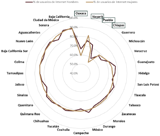 46 El objetivo se considera alcanzado si el puntaje de paridad de género -definido como el porcentaje de mujeres que usan Internet dividido por el porcentaje de hombres que usan Internet- es al menos 0,98. (https://datahub.itu.int/dashboards/umc/indicator/?e=MEX&i=34674), consultado el 05-septiembre-2023