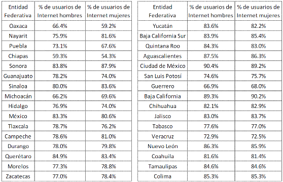 Tabla 3.- Porcentajes de usuarios de Internet de 6 años o más, por género y dominio.