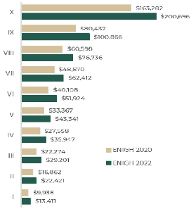 | Gráfica 16. Ingresos corrientes promedio al trimestre por decil Fuente: ENIGH 2020 y 2022 de INEGI | Gráfica 17. Porcentaje del gasto promedio en comunicaciones al trimestre por decil(49) Fuente: ENIGH 2020 y 2022 de INEGI |