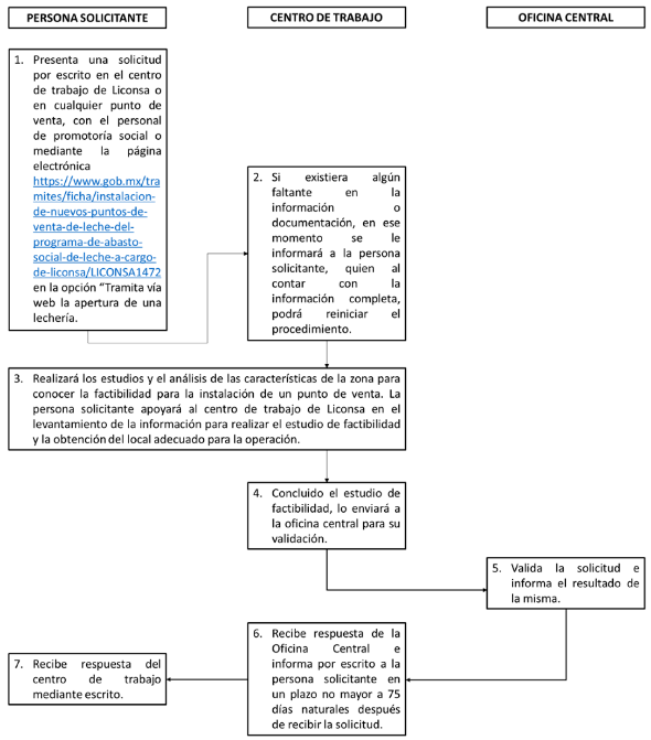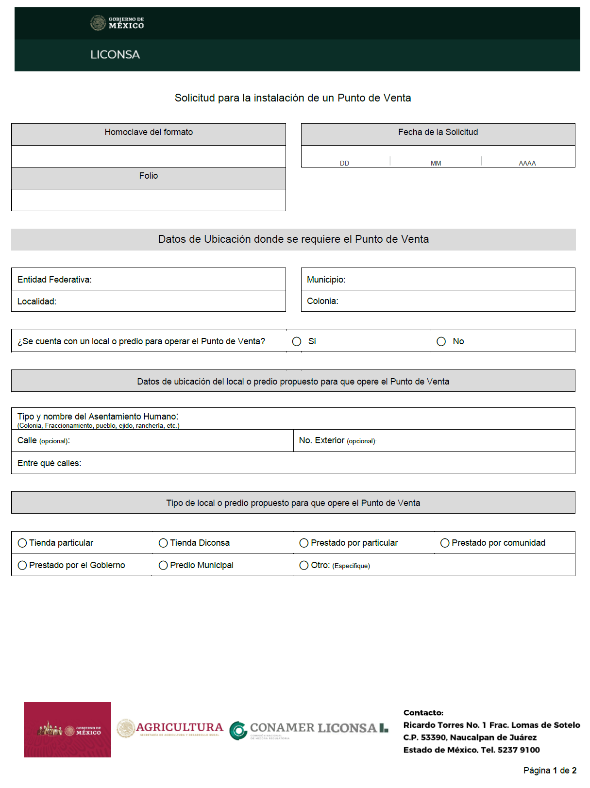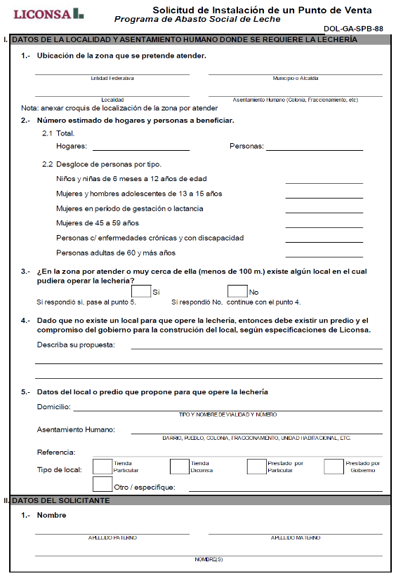 Estudio de factibilidad.- Formato para recopilar datos relevantes acerca de la población potencial de personas beneficiarias, la disponibilidad de local, la ubicación de la zona en donde se requiere instalar un nuevo punto de venta, etc., que sirve para dictaminar la procedencia o no de su instalación. Se puede consultar en el Manual de Procedimiento para la Apertura, Reubicación y Cierre de Lecherías, el cual se encuentra en la página electrónica www.gob.mx/liconsa. http://www.liconsa.gob.mx/normateca-interna/direccion-abasto-social.php
