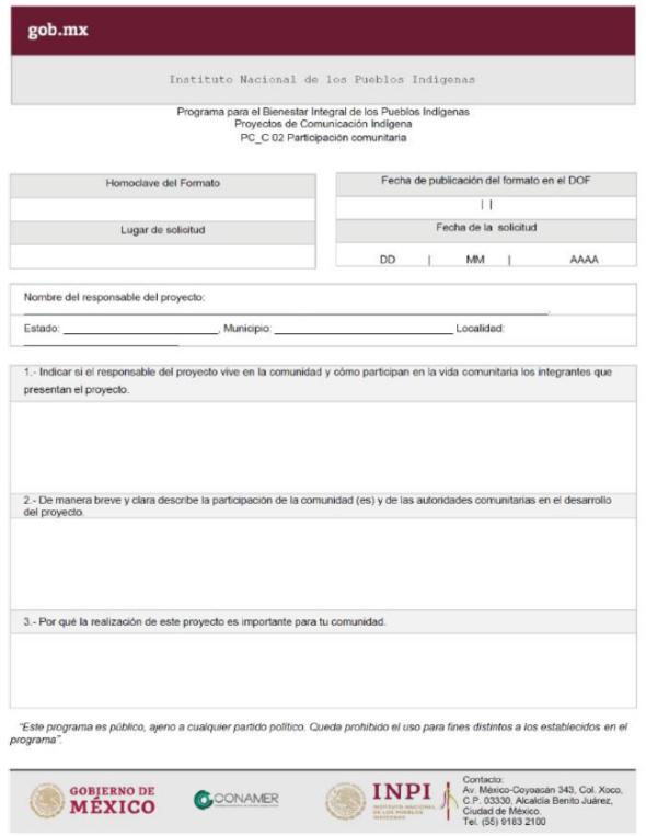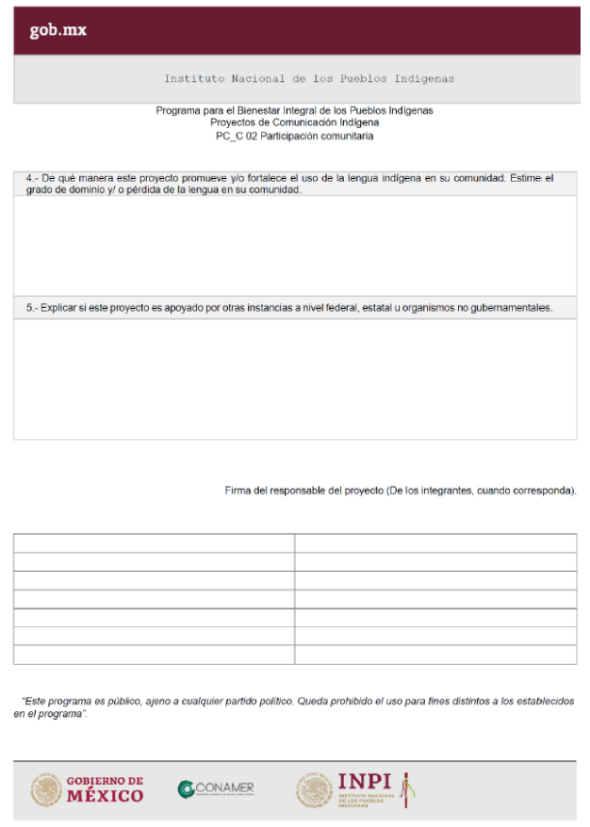 Por medio de la presente me permito informarle que, por así convenir a mis intereses personales, he decidido renunciar de forma personal, voluntaria e irrevocable al apoyo mensual que me era otorgado como promotor (a) comunitario (a) de la modalidad de ___________________del Programa para el Bienestar Integral de los Pueblos Indígenas del Instituto Nacional de los Pueblos Indígenas, por lo cual dejaré de realizar actividades a partir del del mes de de 2024, manifestando que hasta esta fecha no se me adeuda cantidad alguna por ningún concepto.