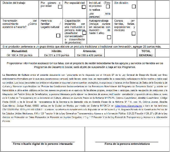 | Nombre completo y firma de la persona artesana | | Nombre completo y firma (de la persona Servidor Público) |