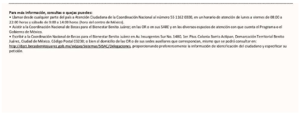 La Coordinación Nacional de Becas para el Bienestar Benito Juárez, Dirección de Atención Ciudadana: Av. Insurgentes Sur No. 1480, 1er. Piso. Colonia Barrio Actipan, Demarcación Territorial Benito Juárez, Ciudad de México. Código Postal 03230; o bien al domicilio de las OR o de sus SARE que correspondan, mismo que se podrá consultar en:
