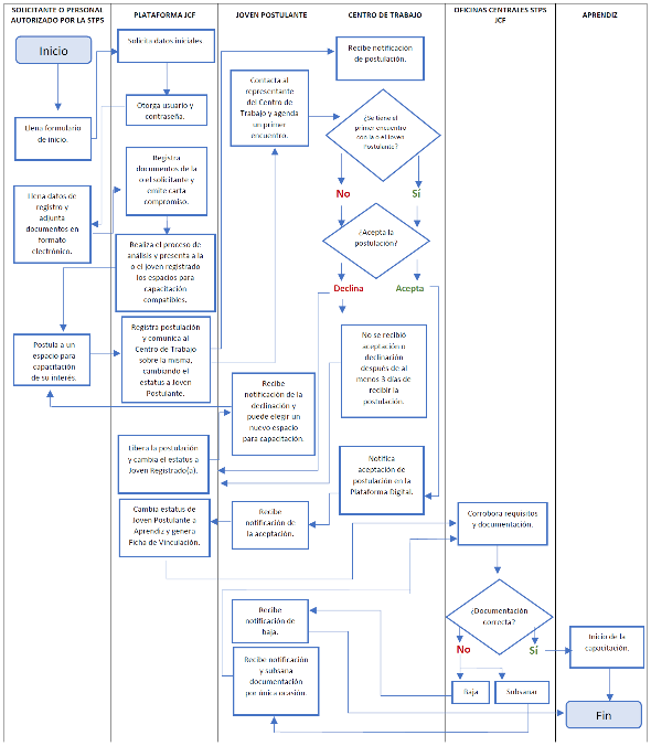 El "CENTRO DE TRABAJO" aceptará o declinará la postulación de la/el "Joven postulante" a través de la Plataforma Digital o del personal autorizado por "LA STPS", dentro de un periodo de al menos 3 (tres) días naturales contados a partir de la postulación, con lo que se completará el cambio de estatus de "Joven postulante" a "Aprendiz" y será sujeto de verificación. Una vez que el "PROGRAMA" corrobore los requisitos y la información proporcionada al momento del registro, se formalizará su participación e ingreso al "PROGRAMA".