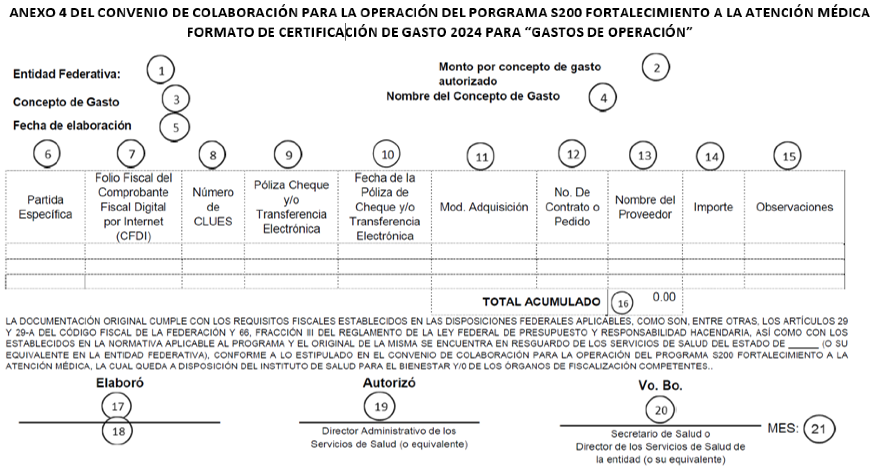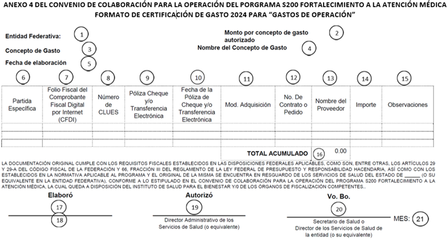 | 29 | Nombre y firma del/de la Secretario(a) de Salud, quien Certifica la comprobación del gasto de conformidad con la normatividad aplicable. |