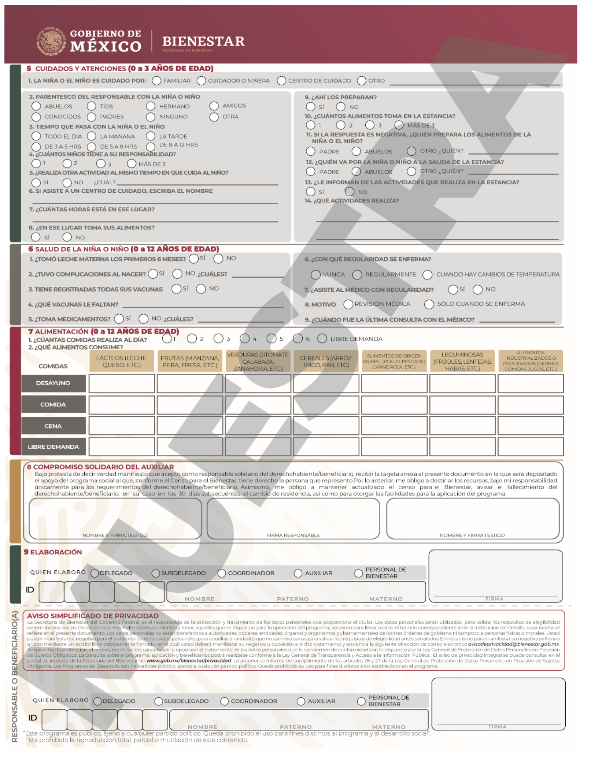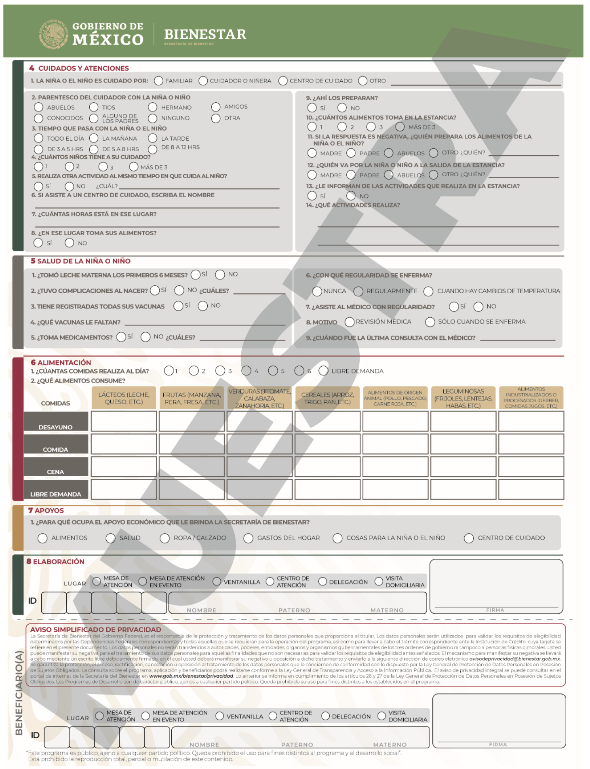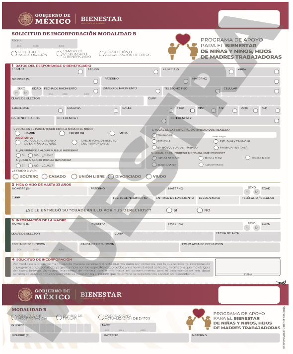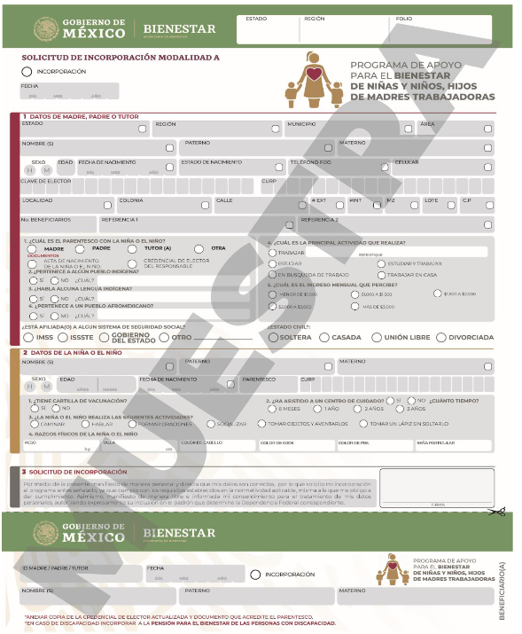 | Apoyo económico bimestral, por cada niña o niño. | $1,600.00 M.N. | Madre, padre solo o tutor con niña(s) y niño(s) a su cargo de recién nacidos hasta un día antes de cumplir los 4 años de edad. |