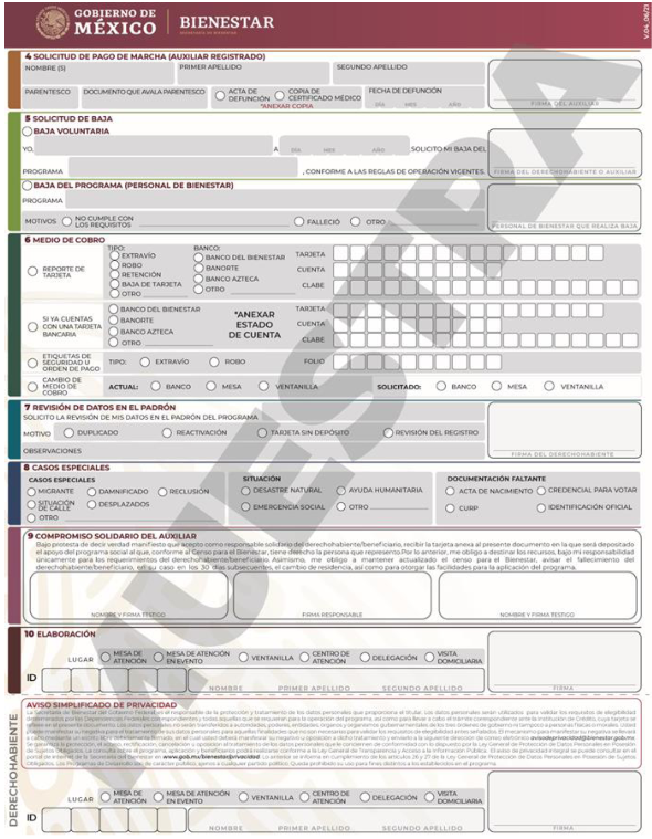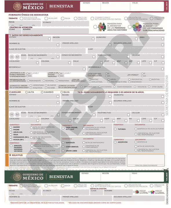 Cualquier trámite relacionado con la pensión por parte de la persona derechohabiente o de su persona adulta auxiliar, deberá realizarse a través del Formato Único de Bienestar (Anexo 2 de las presentes Reglas de Operación), acompañado de la documentación requerida de acuerdo con lo establecido en el numeral 3.3.2 de las mismas Reglas. Los trámites podrán realizarse durante cualquier momento del ejercicio fiscal.