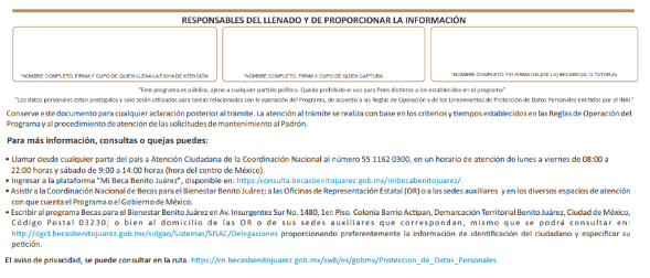 Les informamos que, en caso de requerir información u orientación en el uso del sistema y/o del proceso de actualización de la matrícula para este periodo, se les podrá otorgar información en las Oficinas de Representación y en las SARE de la Coordinación Nacional de Becas para el Bienestar Benito Juárez, o bien, a través del número telefónico _______ ext. _______, ______ y _______.